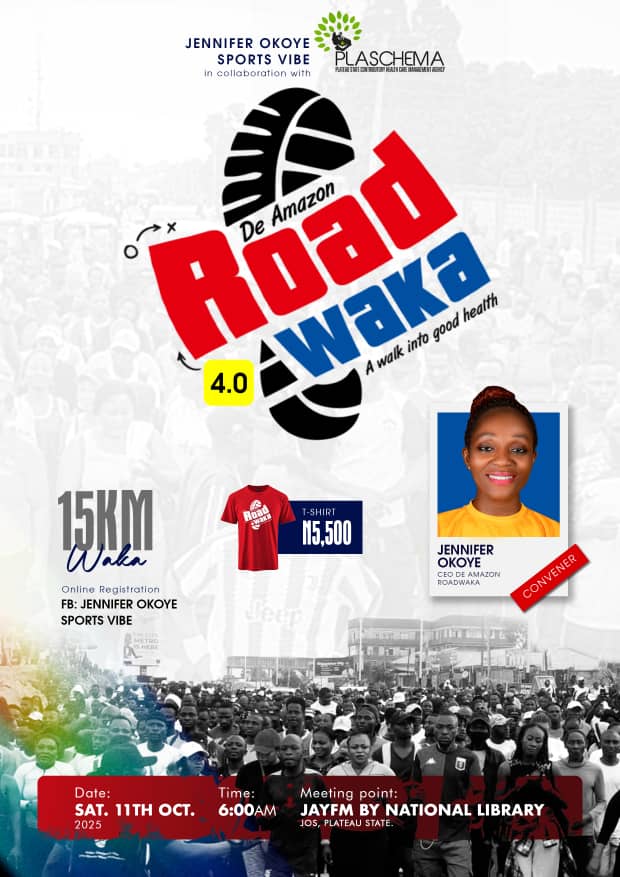 The event, organized by Jennifer Okoye Sports Vibe in collaboration with the Plateau State Contributory Healthcare Management Agency (PLASCHEMA), will take place on Saturday, October 11, 2025, beginning at 6:00 a.m. from JayFM, beside the National Library, Jos.