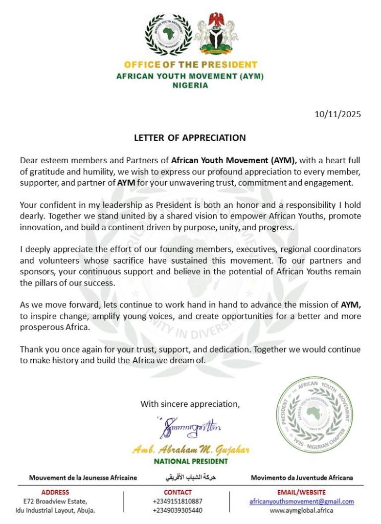 The President of the African Youth Movement (AYM), Amb. Abraham Micah Gujahar, has expressed deep appreciation to members, supporters, and partners of the movement for their unwavering trust and commitment to the organization’s vision.