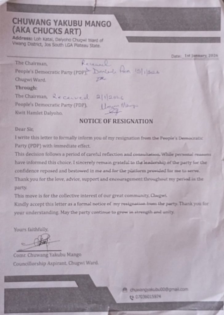 Comrade Chuwang Yakubu Mango, popularly known as Chucks, has officially resigned from the Peoples Democratic Party (PDP) and joined the All Progressives Congress (APC) to pursue his councillorship ambition in Chugwi Ward, Jos South Local Government Area of Plateau State.