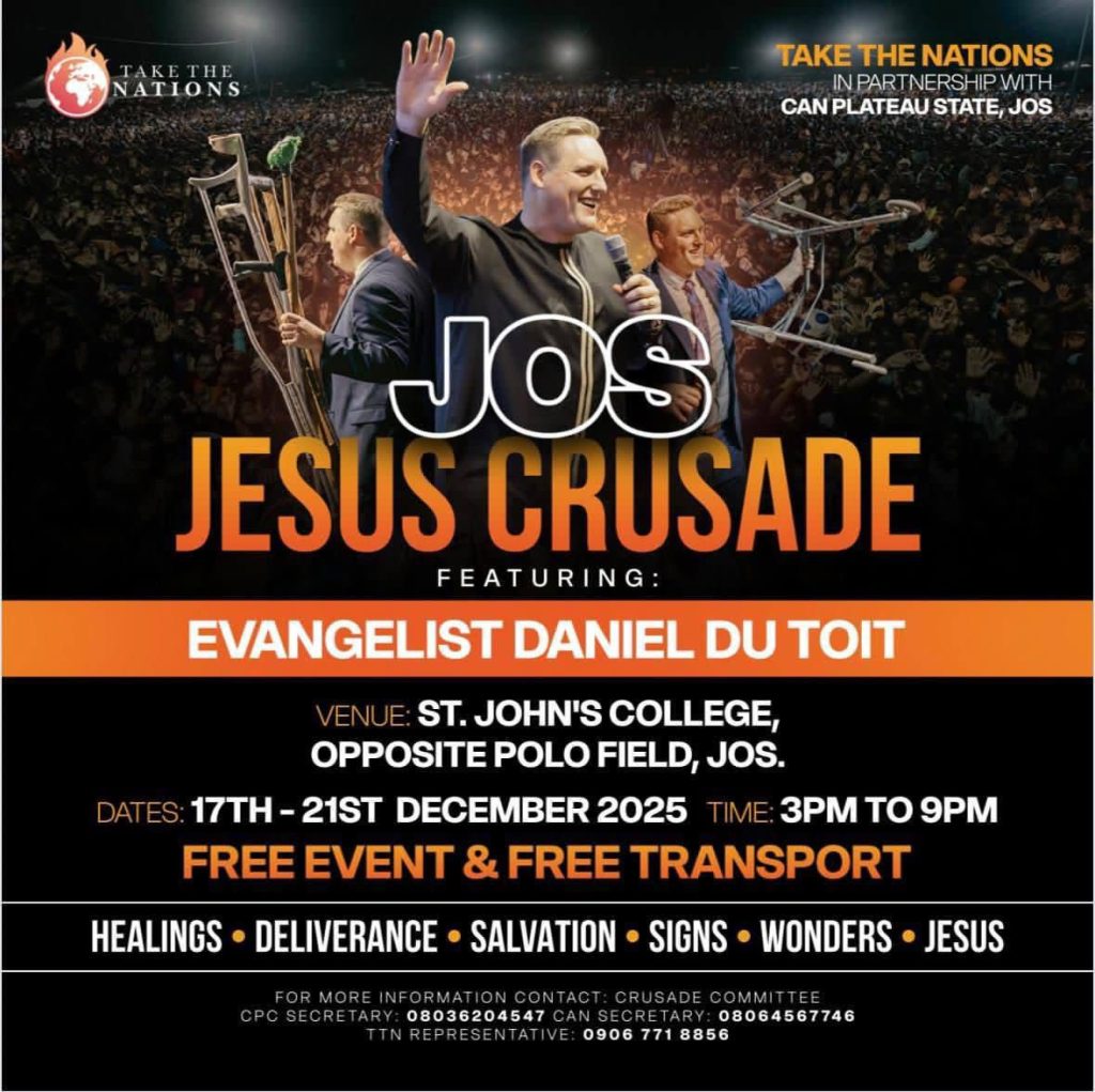 The Christian community in Plateau State is preparing for a major spiritual event as Evangelist Daniel Du Toit, a disciple of the famous Reinhard Bonnke, will lead the Jos Jesus Crusade. The event is scheduled to hold from 17th to 21st December 2025, at St. John’s College, from 3:00 PM to 9:00 PM daily, and entry is free for all.