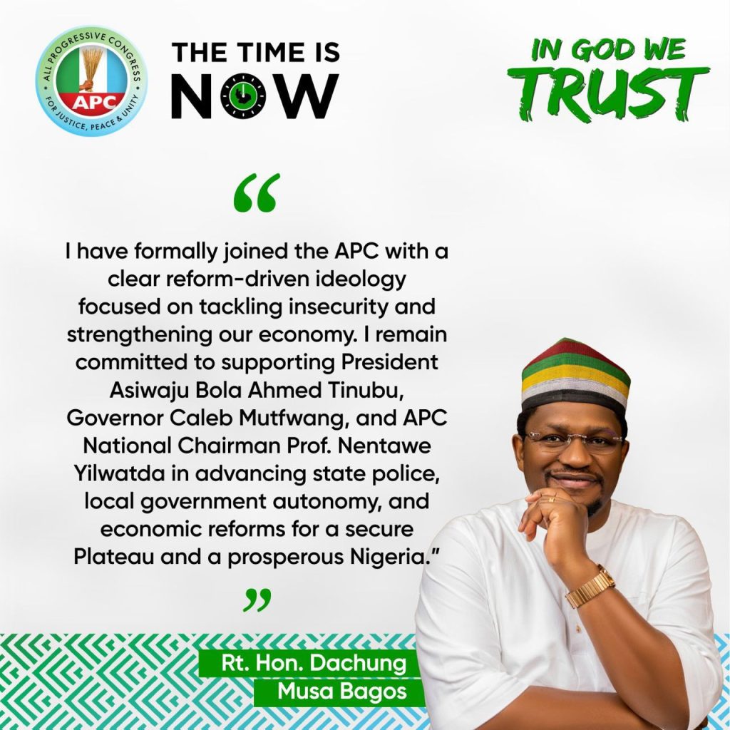 According to him, his decision to align with the APC is rooted in the party’s national outlook and reform agenda, which he believes offers a stronger platform for delivering good governance and sustainable development to Plateau State and the country at large.