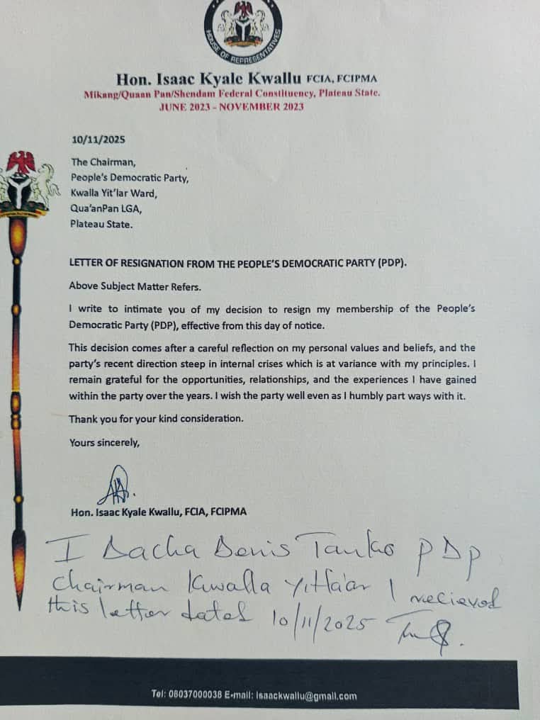 In a letter dated November 10, 2025, and addressed to the Chairman of the PDP in Kwalla Yit’lar Ward, Qua’an Pan Local Government Area, Hon. Kwalu announced his decision to leave the party with immediate effect. The letter was duly acknowledged by the ward chairman, Lacha Denis Tanko, on the same day.