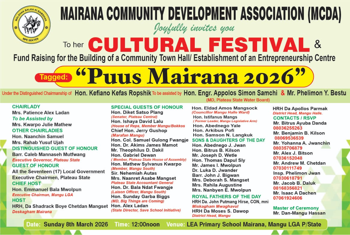 History beckons on March 8, 2026, as Mairana Community of Mangu Local Government Area of Plateau State, holds its first ever ‘Puus Mairana’ (Mairana Day) to celebrate the rich cultural heritage of the people.