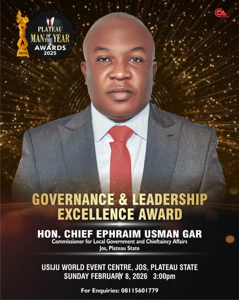 Hon. Chief Ephraim Usman Gar, Commissioner for Local Government and Chieftaincy Affairs in Plateau State, has been honoured with the Governance and Leadership Excellence Award at the 11th edition of the Plateau Man of the Year Awards (PMYA) for his outstanding contributions to grassroots governance and public service.