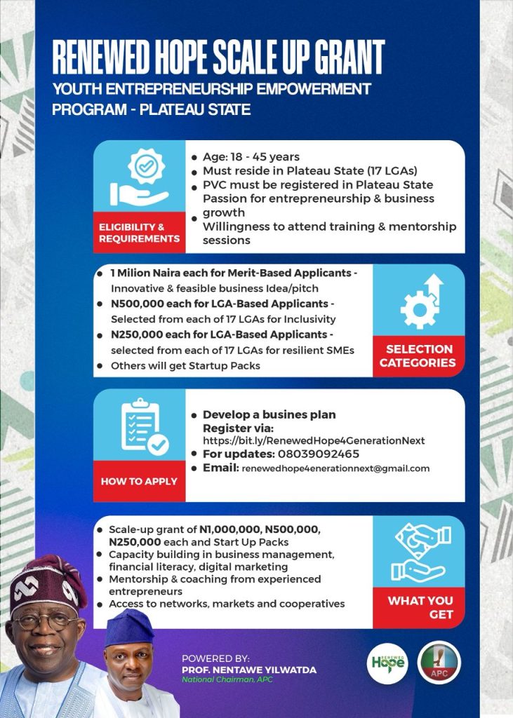 Young entrepreneurs in Plateau State now have a new opportunity to grow their businesses as the Renewed Hope Scale-Up Grant—an initiative sponsored by Professor Nentawe Yilwatda, National Chairman of the All Progressives Congress (APC)—opens for applications across the state.