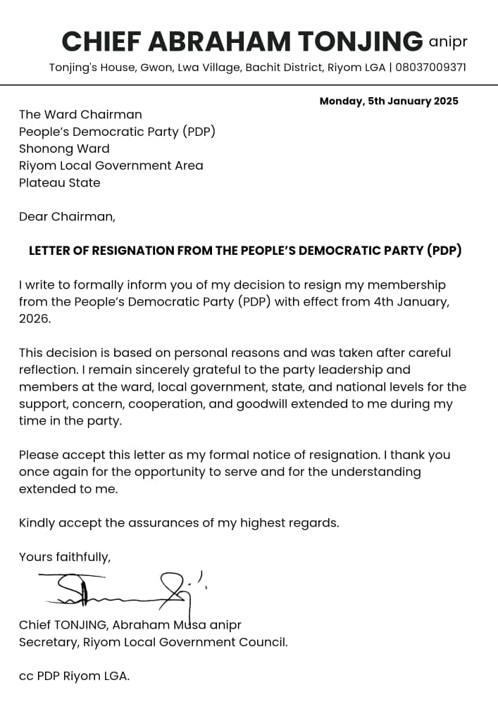 The resignation was contained in a letter dated January 4, 2026, and addressed to the PDP Ward Chairman of Shonong Ward in Riyom Local Government Area of Plateau State.